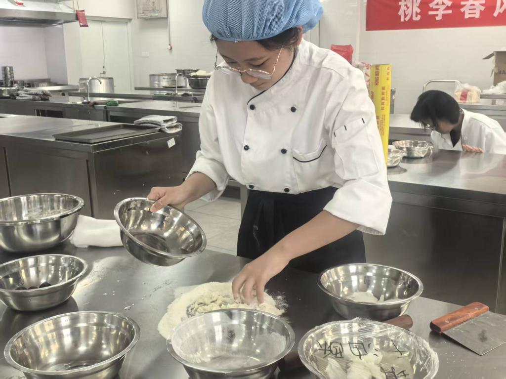 教师们纷纷亮出“绝活”,无论是需要精准火候掌控的抻面,还是工艺繁复、造型精美的象形点心,都展现了他们高超的专业技能和深厚的职业素养。教师们的精湛表演,不仅是一场高水平的技能比拼,更是一次生动的教学示范交流,为观摩的师生提供了宝贵的学习机会,有效促进了“双师型”教师队伍的建设。