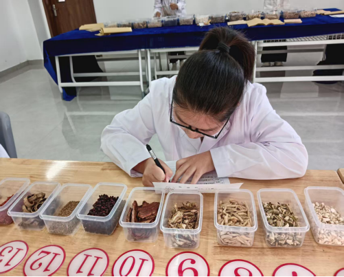 为确保赛事专业性与权威性,本次大赛严格参照《中国药典》2020 年版标准及国家相关职业规范设置竞赛内容,重点打造中药鉴定、中药调剂两大核心模块,融合理论考核与实操比拼,总分以百分制精准评定。其中,中药鉴定模块占比 60% ,对选手技能提出高要求:需在20 分钟内完成20味中药材及饮片的性状识别、10味药材的真伪鉴别,还需完成3种中药粉末的显微制片、特征绘制与精准鉴定,全方位考察选手对药材特性的掌握程度;中药调剂模块占比40% ,选手需从13 味饮片中精准筛选并调配 10 味×3 付处方,既要保证剂量精准无误,又要严格遵循操作规范,兼顾效率与质量,充分贴合岗位实际操作场景。