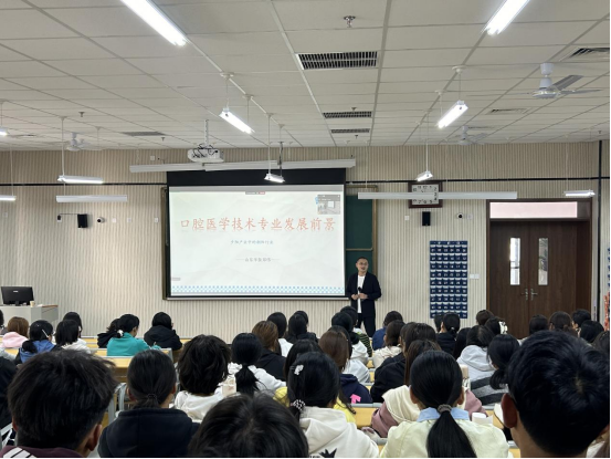 讲座中,郑总结合自身二十余年的行业从业经验,以“夕阳产业中的朝阳行业” 为核心切入点,深度解析了口腔医学技术行业的变革历程与未来发展趋势。他从人口老龄化加剧、居民口腔健康意识提升、口腔医疗技术创新等多维度,阐述了行业的市场需求与发展潜力。“随着人们对口腔美观与功能需求的不断提高,数字化口腔技术、3D 打印义齿、个性化修复方案等新兴领域正迎来爆发式增长,这为口腔医学技术专业人才提供了广阔的职业舞台。”郑总的观点让在场同学们对专业前景有了更清晰的认知。