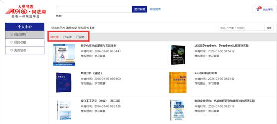 3、我的荐购:【个人中心】→【我的荐购】中可查看到所有的荐购书目,及图书馆的采纳情况。