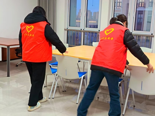 桌椅归位组的工作则考验着志愿者们的耐心与严谨。由于日常教学使用,部分课桌椅出现了歪斜、错位的情况。志愿者们两人一组,一人扶稳桌椅,一人调整位置,按照“横平竖直、间距均匀”的标准,将每一间教室的课桌椅重新排列。从第一排到最后一排,从左侧过道到右侧窗边,大家反复比对、精细调整,确保每一张课桌、每一把椅子都整齐划一,为师生打造出规整有序的课堂布局。