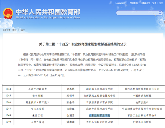 近日,教育部办公厅发布“关于第二批“十四五”职业教育国家规划教材遴选结果的公示”。由我院书记、院长金潮苏担任主编的教材《采油工程》历经多轮严格评审,成功入选,这是我院在教材建设与教育教学改革领域取得的又一重大国家级成果。