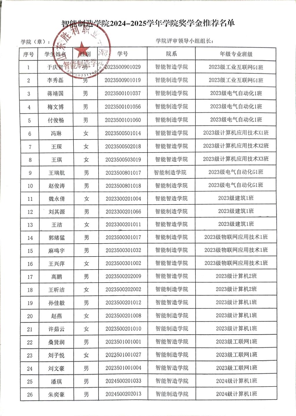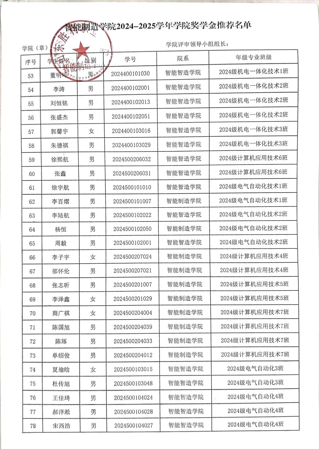 智能制造学院2024-2025学年学院奖学金推荐名单公示